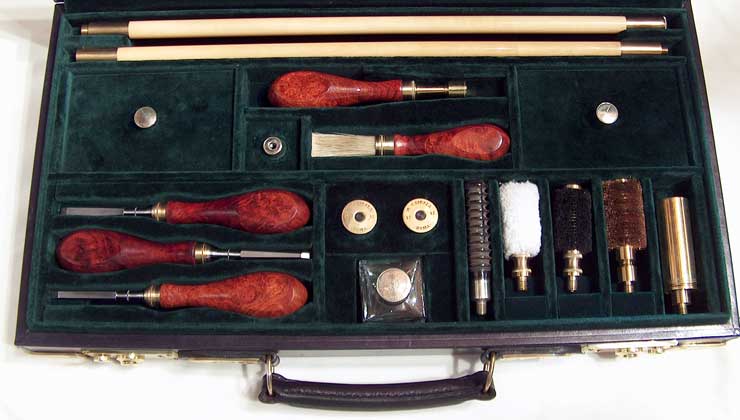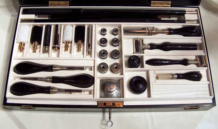 | La tradizione della grande archibugieria, pur evolvendosi e mutando in relazione al diverso contesto socio culturale con le mutazioni del quale ogni attività deve confrontarsi, si è mantenuta viva e vitale, ma la relativa accessoristica non ha mantenuto il passo. E addirittura, mentre la fabbricazione dei fucili fini ha subito -in termini assai ristretti- una certa evoluzione, non possiamo dire generalmente altrettanto per quanto riguarda la relativa oggettistica. | |||